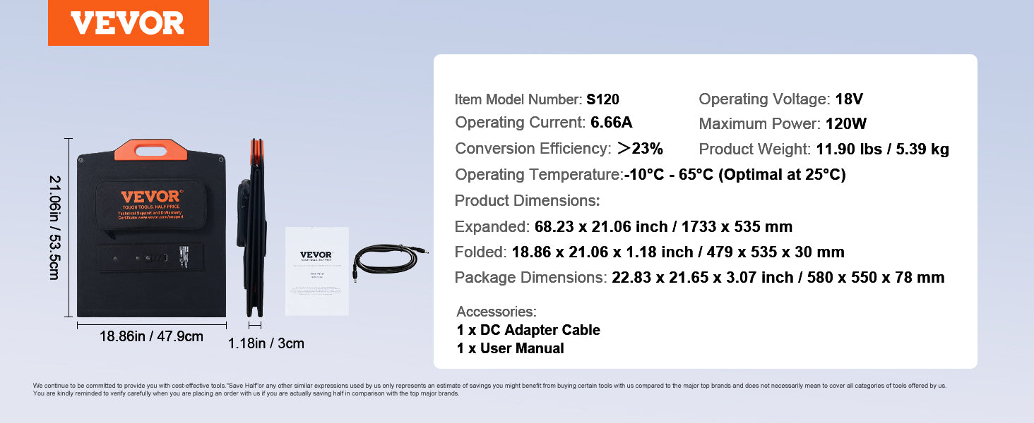 Folds down to a compact 25×21 inches and weighs only 7.5kg (16.6 lbs) — easy to carry and store for camping, fishing, road trips, or RV power.